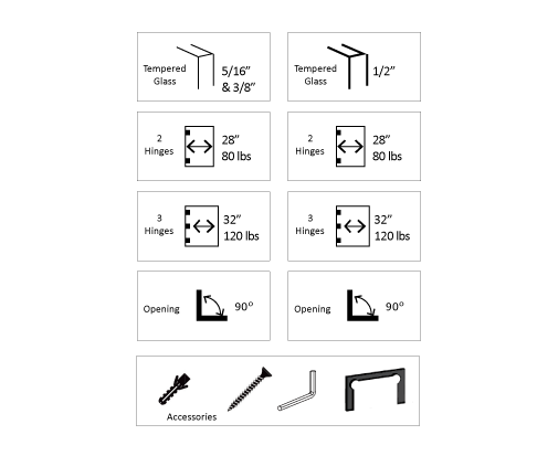 • Glass Thickness: 5/16" (8 mm) to 1/2" (12 mm) tempered glass